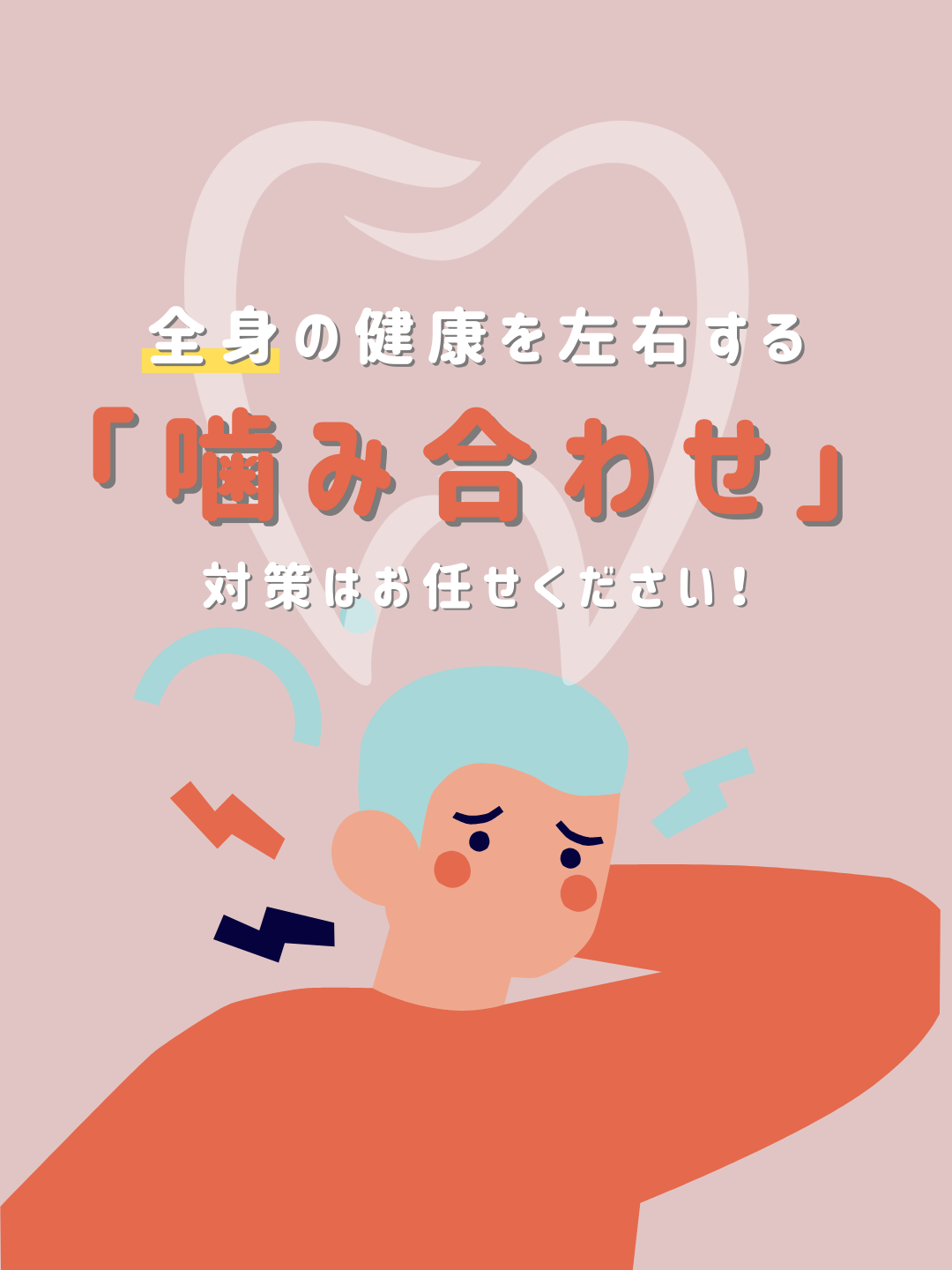 最近こんな症状ありませんか? 肩こり・首こりがひどい、頭痛が頻繁に起こる、顎が痛む、口が開けにくい、顔の歪み、歯ぎしり・食いしばり、消化不良、発音のしづらさ…これらは 噛み合わせの悪さが原因 かもしれません。